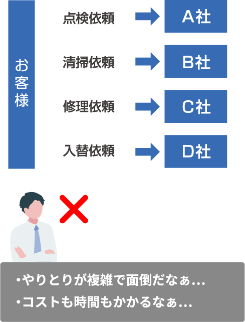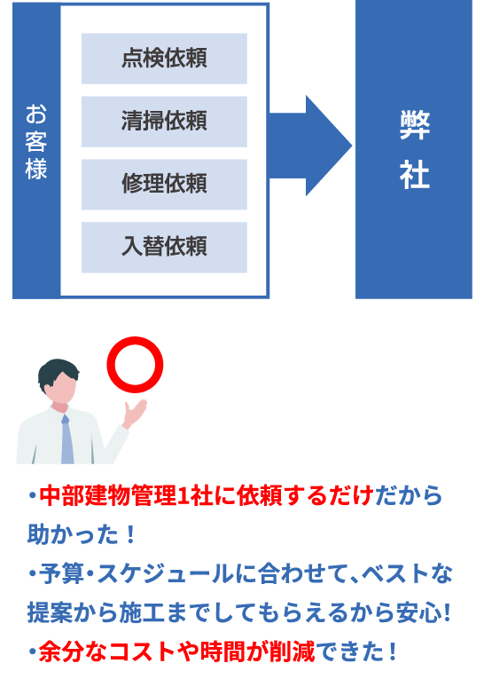 Work flow 点検・清掃・修理・入替依頼の流れ 他社と弊社の違い 中部建物管理なら自社施工ですべて対応するため、ご提案から施工までまとめてご依頼いただけます!余分なコストや時間を削減することが出来ます。 他社の場合 弊社「中部建物管理」の場合